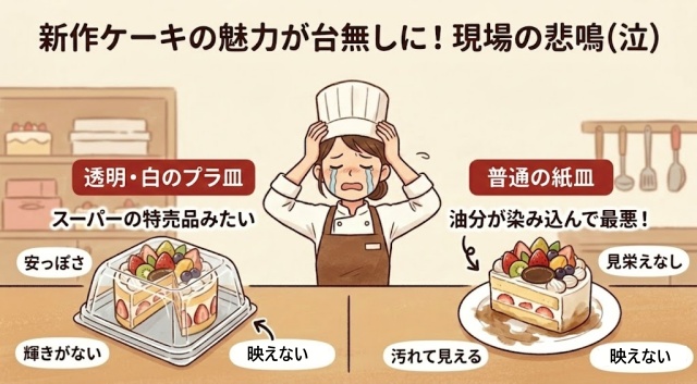 せっかくの新作ケーキも、透明や白のプラ製小皿に乗せると、なんだかスーパーの特売品みたいで…。かといって普通の紙皿だとケーキの油分が染み込んで見栄えが最悪なんだよね(泣)