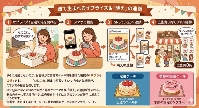 さらに見逃せないのが、お客様がご自宅でケーキ箱を開けた瞬間の「サプライズ感」です。
