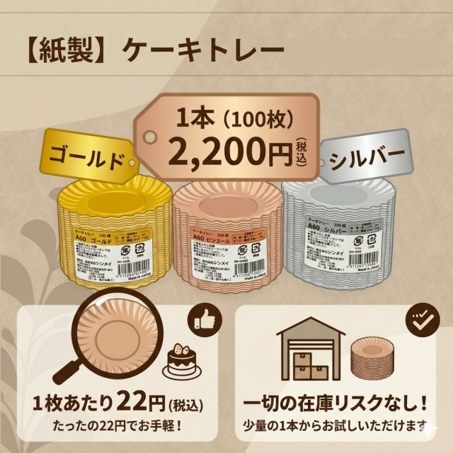このケーキトレー、なんと『1本(100枚入り)2,200円(税込)』からご注文いただけます。1枚あたりたったの22円で、一切の在庫リスクなくお試しいただけるんですよ。