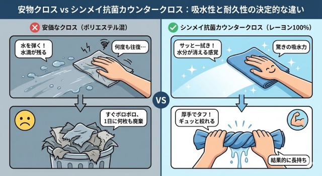 安いカウンタークロスとシンメイの抗菌カウンタークロスとの違いを解説した図