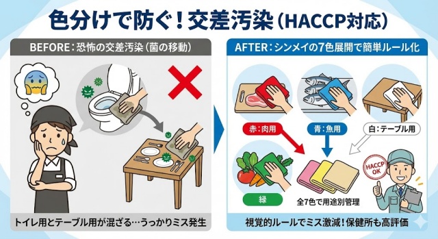 肉用は赤、魚用は青、テーブル用は白など、視覚的にルール化するだけでミスは劇的に減ります。
