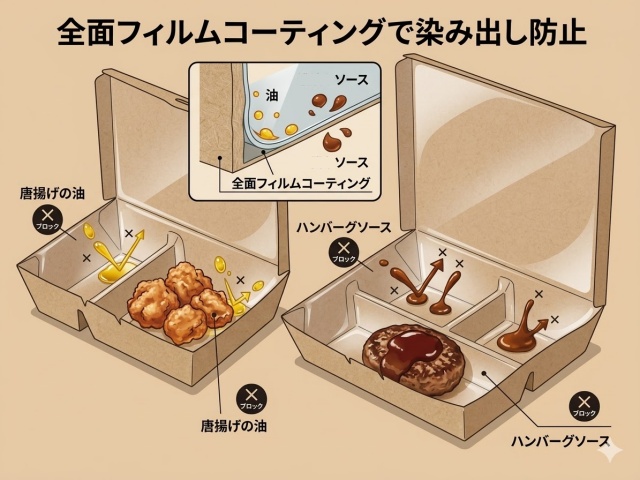さらに、容器の内側全面にPP(ポリプロピレン)フィルムを貼っているため、ソースの水分や唐揚げの油分が紙に染み込んで仕切りがふやける心配もありません。