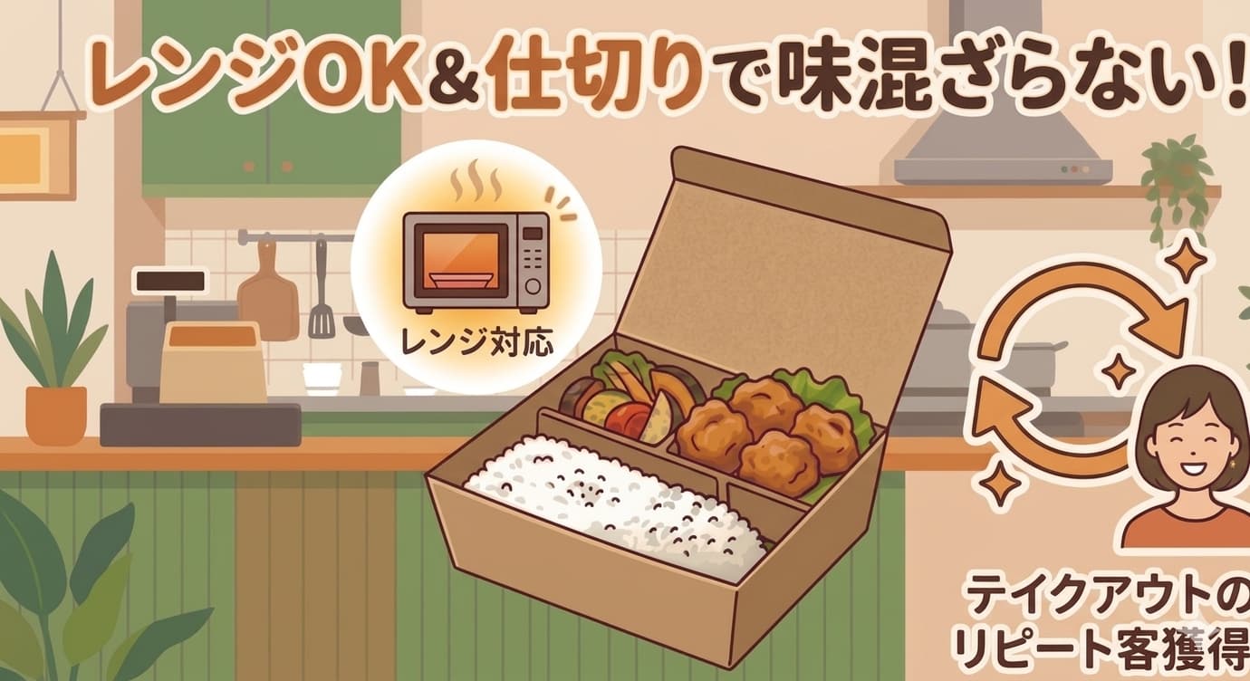 美味しい料理はもちろんですが、実はお客様が一番求めているのは「家事からの解放」なんですよ。このペーパーランチボックスなら、容器のまま電子レンジで温め直しが可能です!