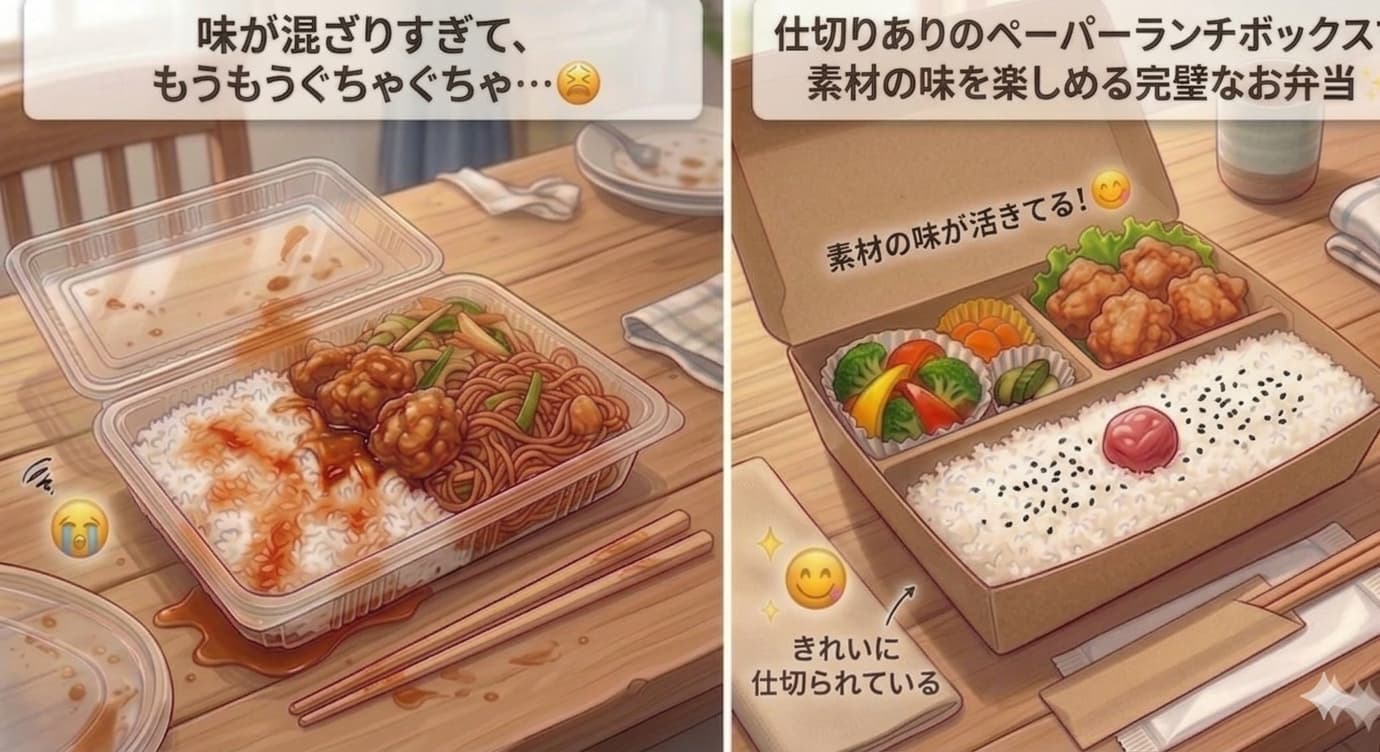 仕切りありの紙製弁当箱で「味が混ざる悲劇」をしっかりブロック!